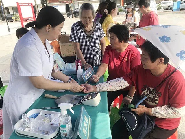 活动开始,社工与医护人员整理义诊摊位,现场设置常见慢性病、痔疮专科问诊区,配备了必要的医疗设备如血压计,血糖仪和中频脉冲治疗仪等,并有医生专家在现场提供服务。义诊摊位前聚满了到来的长者,免费血压测量、快速血糖检测服务备受青睐。医护人员细致检查,对结果进行一对一讲解,及时将数据反馈给长者,并针对血压、血糖异常的居民进行重点提醒,叮嘱其定期监测指标、遵循医嘱治疗,提供个性化的健康生活指导。