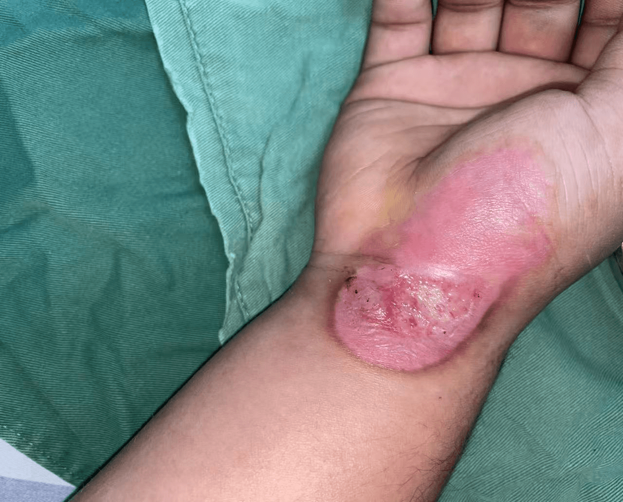2026年2月6日患者因右手腕部机器压伤,于外院治疗一周后返乡,期间在当地诊所处理创面。2月27日来我院就诊时,可见腕部伤口约4cmX3cm,创面被黑痂覆盖,伴流脓、渗液较多。我院创面修复团队详细评估病情,建议住院系统治疗,患者暂未配合。后在我院门诊接受专业清创、规范换药等对症治疗,经过一周精心护理,患者伤口基本愈合。