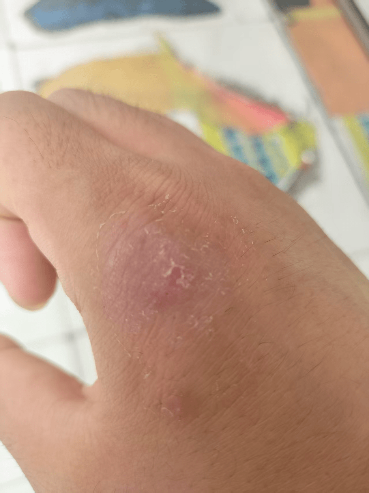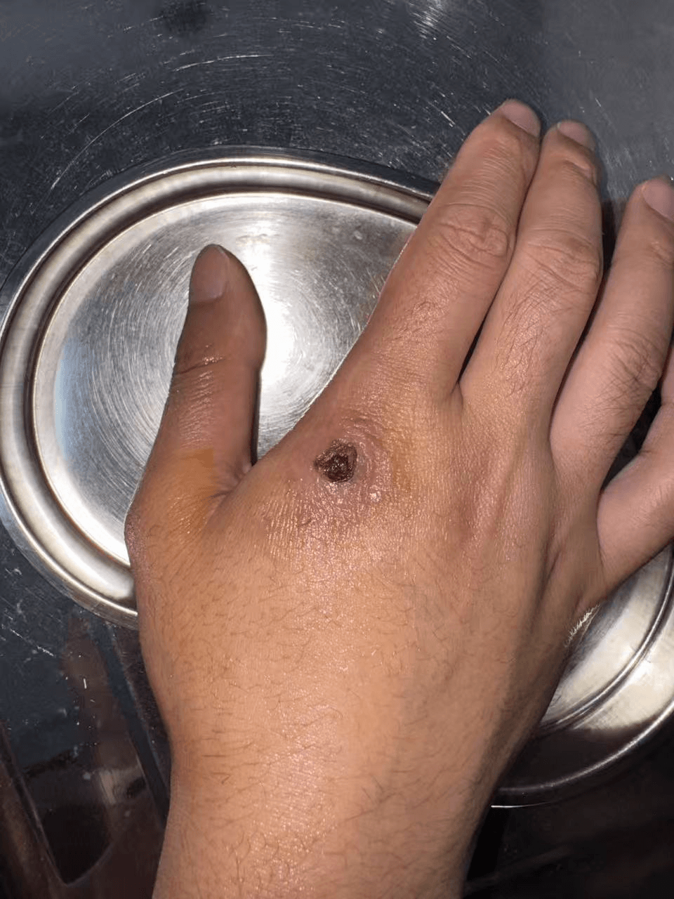 2026年2月4日患者右侧手背第1掌骨中远1/3处因机器高温烫伤,先后在诊所及其他医院治疗约二十天,创面仍流脓、愈合不佳。2月27日来我院就诊:经专业清创、规范换药等对症治疗,康复效果显著,仅5天创面便顺利愈合,返回工作岗位。